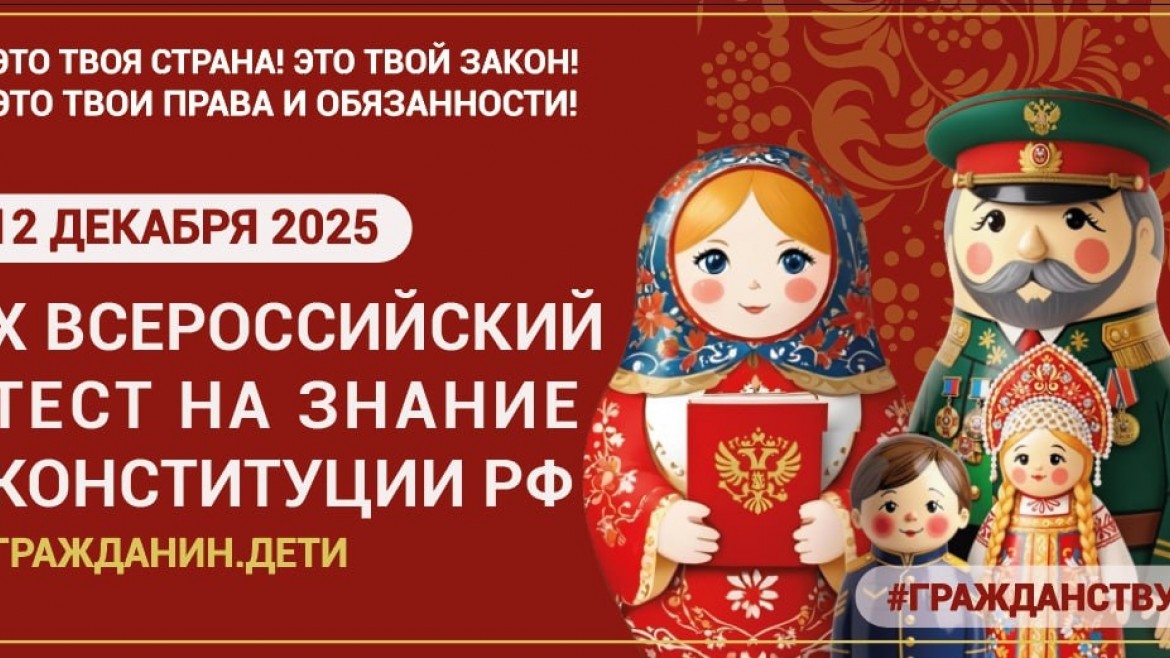 ⠀ ⠀ С целью повышения правовой грамотности населения, осознания гражданских прав и обязанностей, формирования справедливого общества, Всероссийское общественное движение «Гражданин» 12 декабря 2025 года с 9:00 часов до 23:59 часов проводит «Всероссийский тест на знание Конституции Российской Федерации».